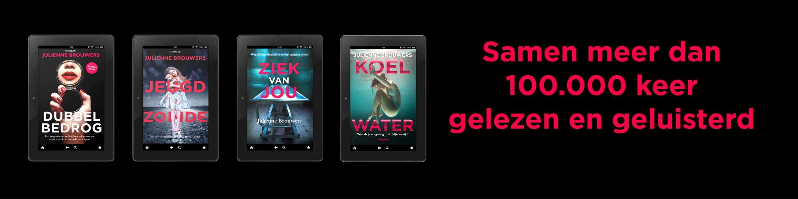 - Mijlpaal: 100.000 Lezers en Luisteraars Bereikt!Julienne Brouwers Viert Bijzondere Mijlpaal: 100.000 lezers en luisteraars Thrillerschrijver Julienne Brouwers heeft een indrukwekkende mijlpaal bereikt: